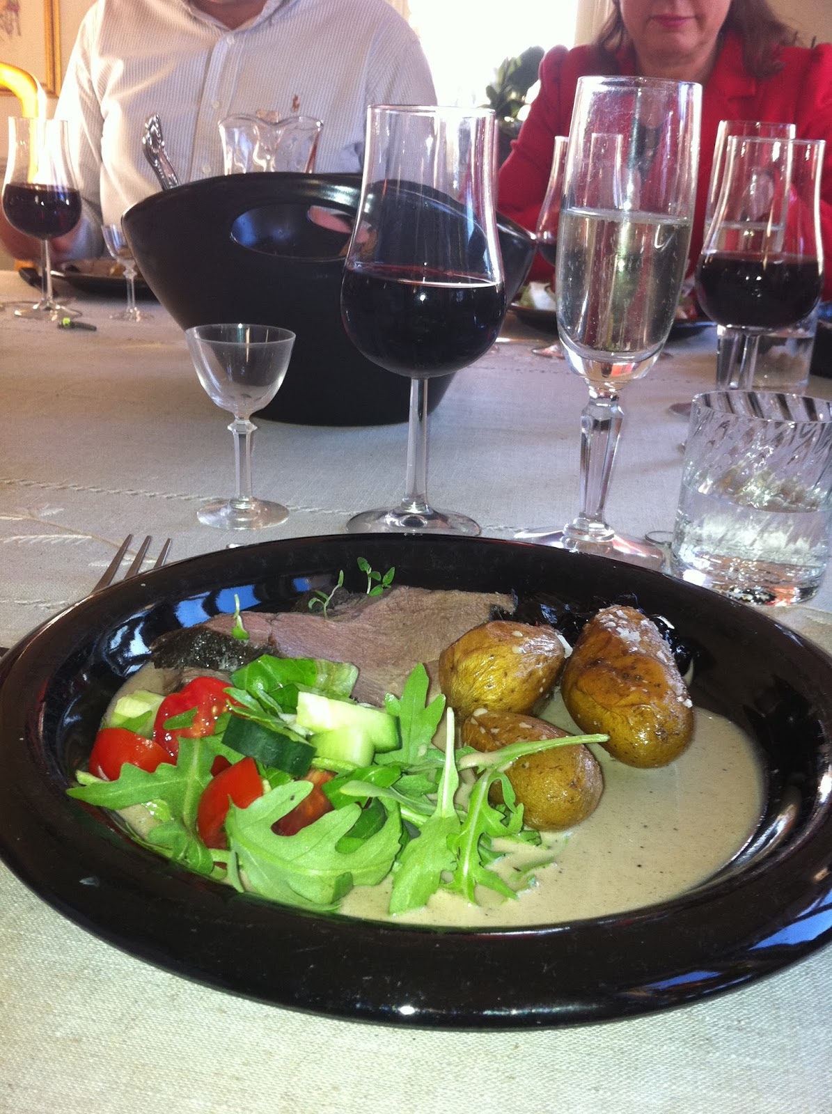 | Varmrätten! Älgstek, god sås, ugnsbakad potatis, rönnbär o vinbärsgelé, sallad! Till det ett fantastiskt Amaronevin som inhandlats på vingård! |